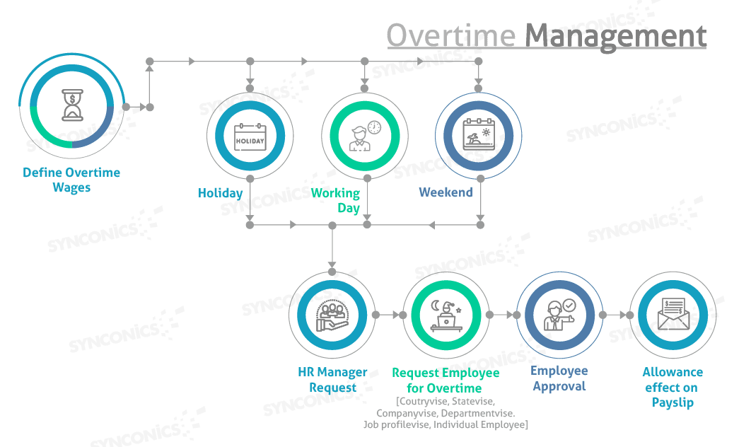 HR officers request the employees to work overtime, on their approval the request is processed. After commencing the overtime duty, the Al Sahal HR system automatically calculates the hourly overtime pay on the payslips, with configured time limits, holidays, working days, weekends, etc.