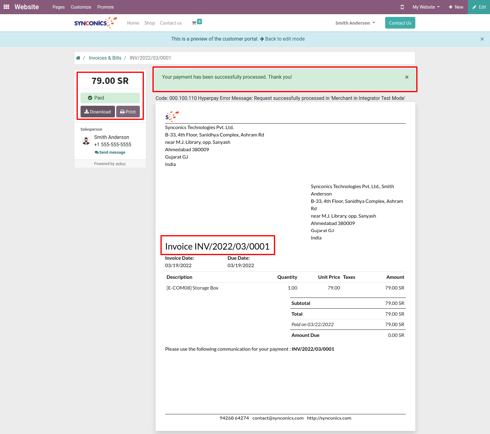 Checked the invoice details where you can click on “Pay Now” Button. Select HyperPay payment acquirer and Click on ‘Pay Now’ Button. It will redirect to the checkout page with Iframe of HyperPay payment.